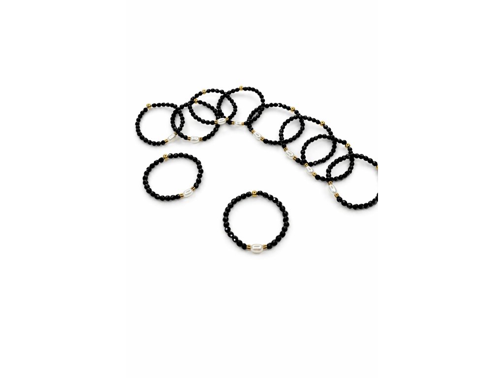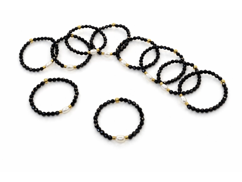 Jemný prstýnek z přírodních materiálů je tvořen drobnými broušenými korálky černého spinelu, který je ceněný pro svůj hluboký lesk a nadčasovou eleganci. Dominantním detailem je říční perla, jež prstýnku dodává jemnost, ženskost a přirozený půvab.