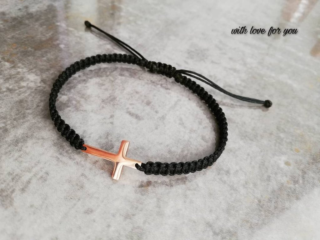 ocelový křížek v rose gold barvě opletený černou šňůrkou silnou 8 mm