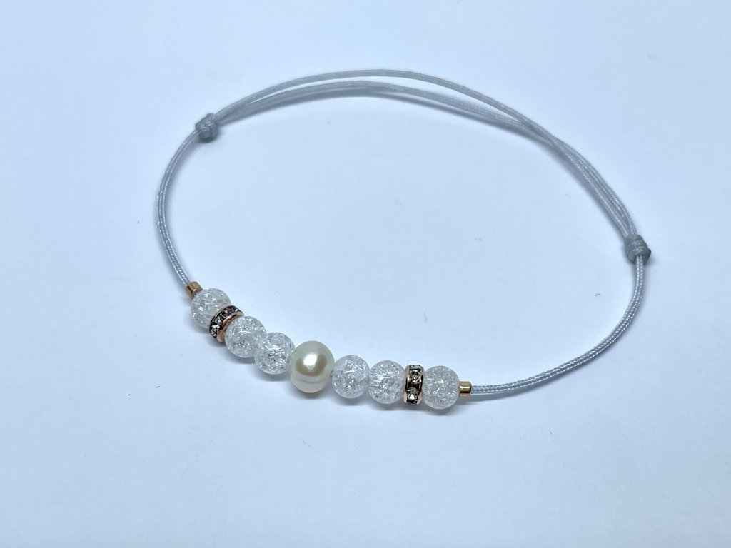 křišťál je velikosti 4 mm, perlička cca 5 mm, rondelky ze stálobarevného kovu v rose gold barvě, síla šňůrky je 0,8 mm