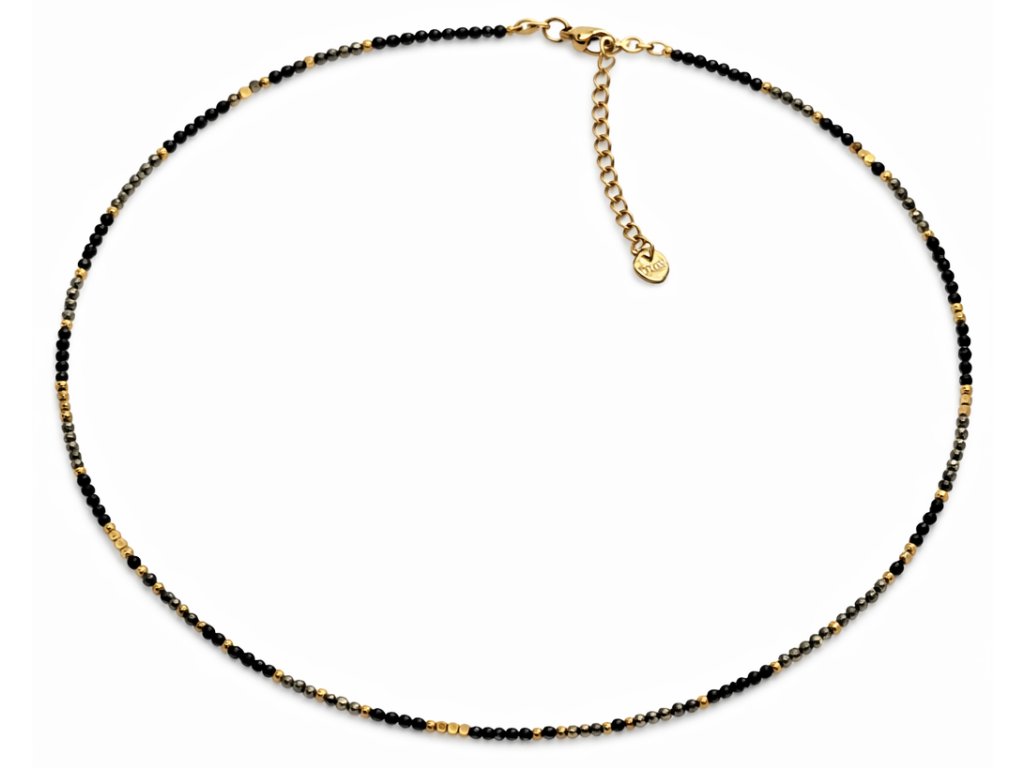Elegantní choker ze zlatem plněné oceli, zdobený drobnými kamínky spinelů, pyritu a hematitu, které společně vytvářejí harmonickou kombinaci tmavých a zlatavých tónů. Jemný kontrast kamenů dodává šperku moderní, přesto nadčasový vzhled.