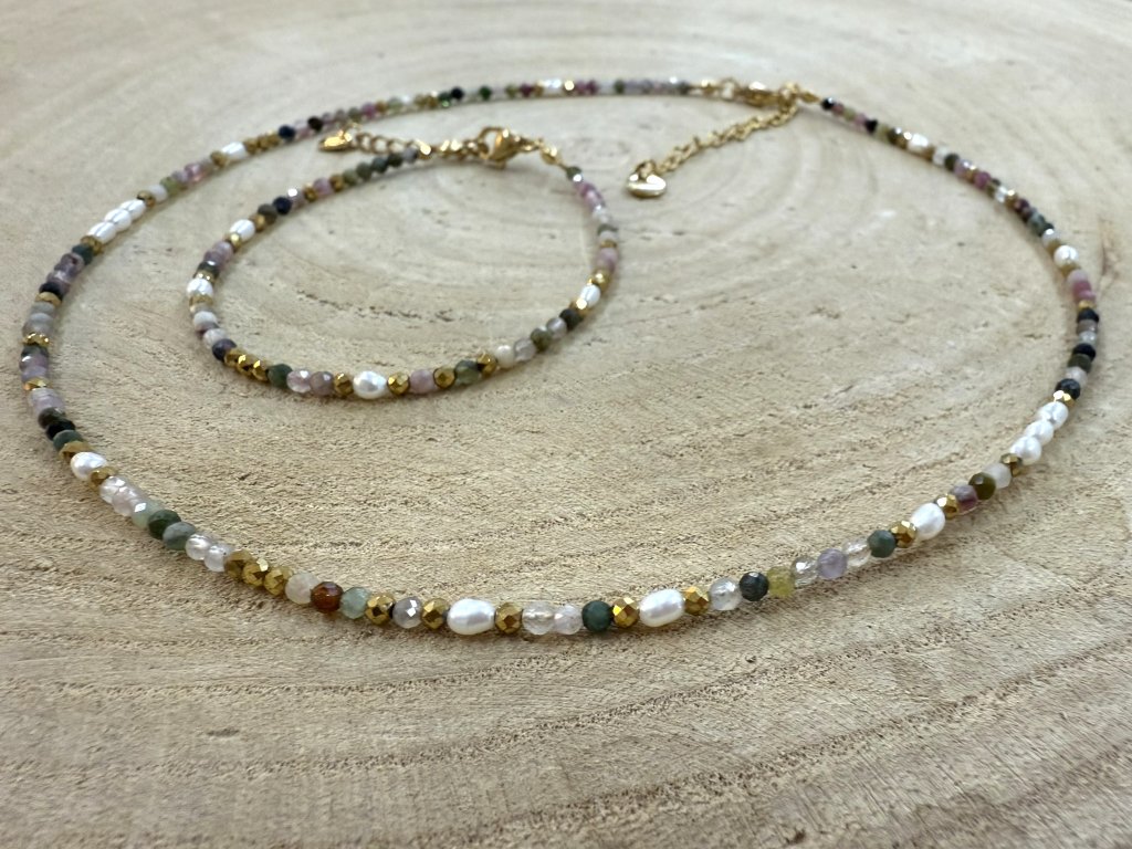 Jemná a elegantní sada náhrdelníku a náramku vytvořená z broušeného turmalínu (3 mm), doplněná o pravé říční perly a pokovený hematit ve zlatém tónu. Každý kousek je ručně sestavený z drobných minerálních korálků, které spolu vytvářejí nádhernou kombinaci barev – od jemných pastelů až po hlubší přírodní odstíny.