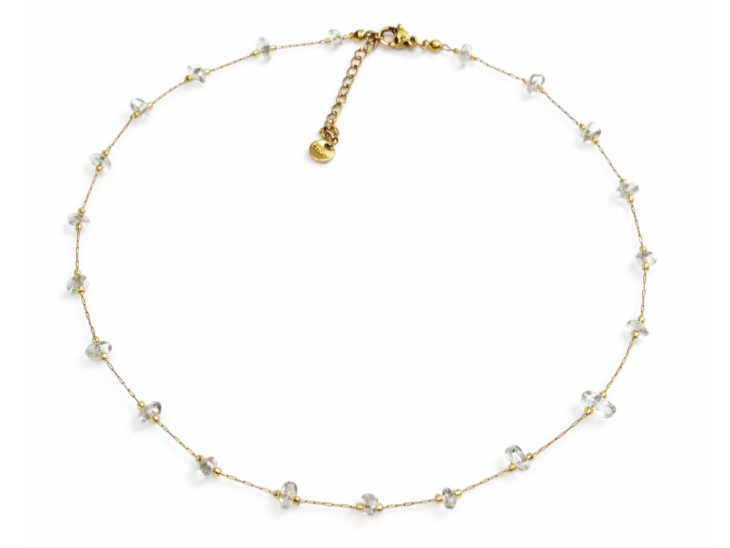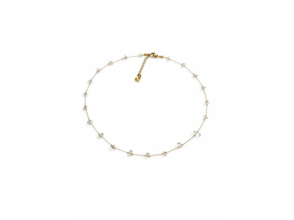 Elegantní choker ze zlatem plněné oceli, zdobený drobnými kamínky přírodního křišťálu, které jemně zachycují světlo a dodávají šperku čistý, přirozený lesk. Lehký řetízek působí na krku velmi jemně a elegantně, zatímco křišťálové detaily vytvářejí harmonický a nadčasový dojem.