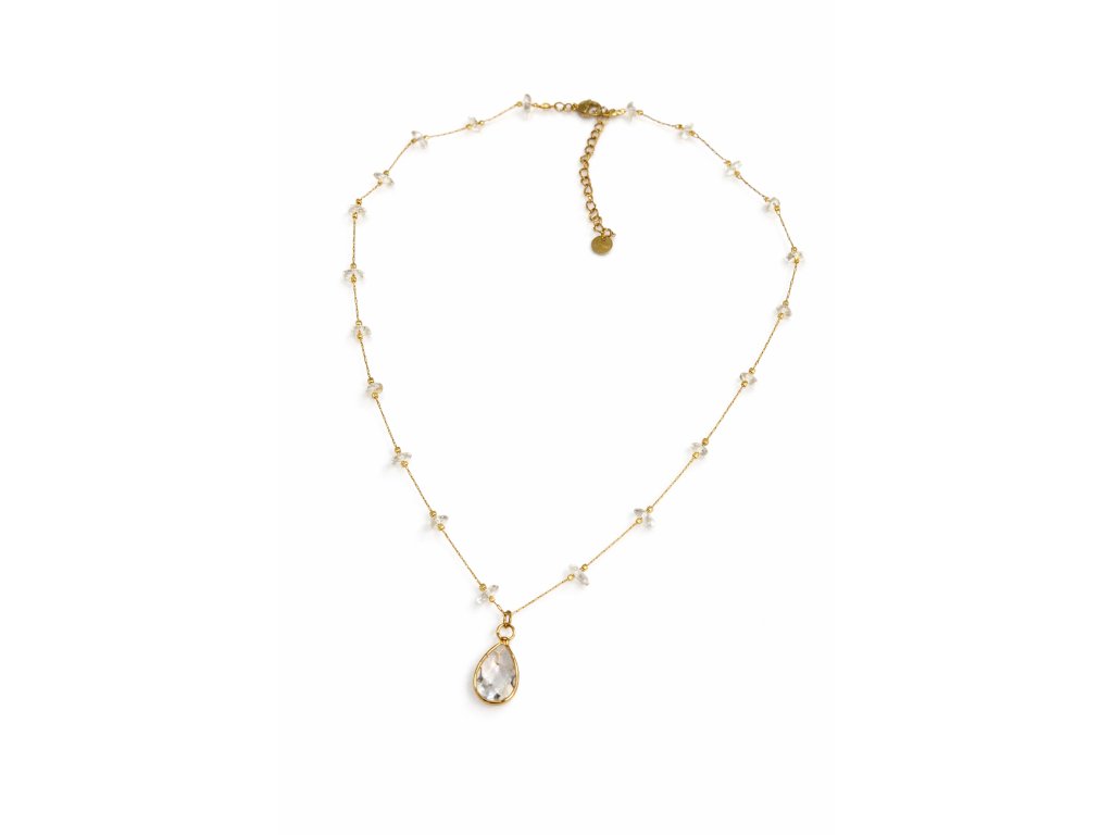Elegantní a nadčasový náhrdelník, který vyniká svou lehkostí a jemným třpytem. Základem je tenký řetízek ze zlatem plněné oceli, doplněný drobnými nepravidelnými kamínky čistého křišťálu, které dodávají šperku přirozenou krásu a decentní lesk. Dominantou náhrdelníku je kapkovitý přívěsek z broušeného křišťálu zasazený do zlatého lůžka.