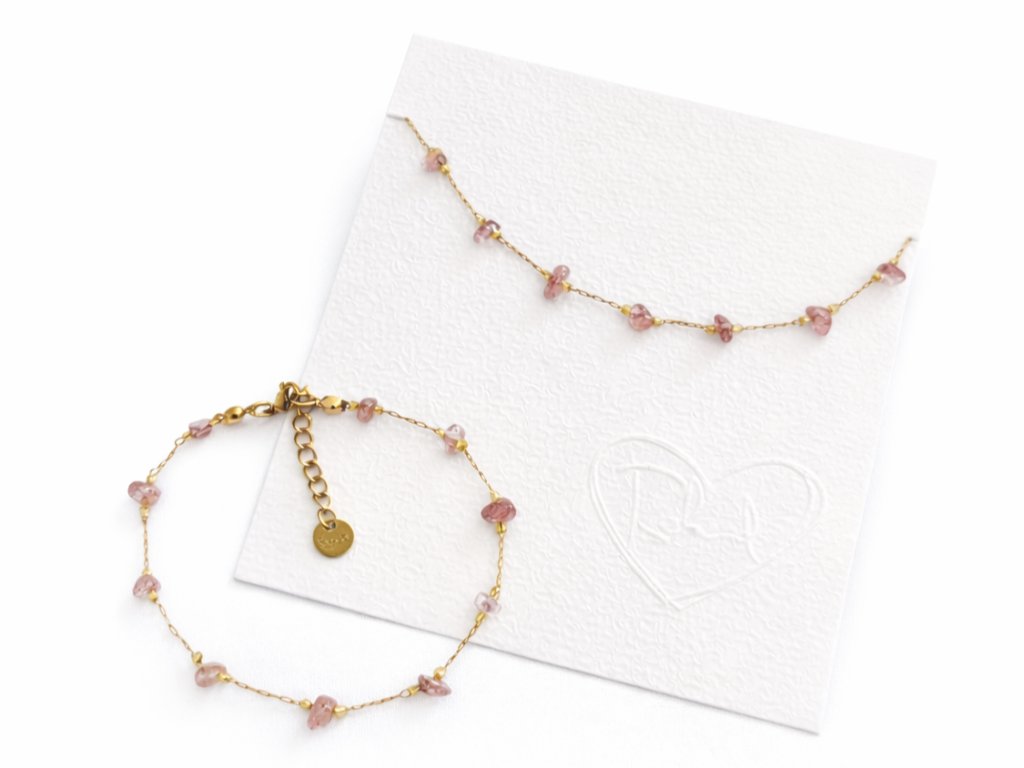 Elegantní náramek ze zlatem plněné oceli, doplněný drobnými kamínky přírodního růženínu v jemných růžových tónech. Díky lehkému a minimalistickému provedení působí náramek velmi něžně a přirozeně, zároveň však dodává outfitu ženský a harmonický akcent.