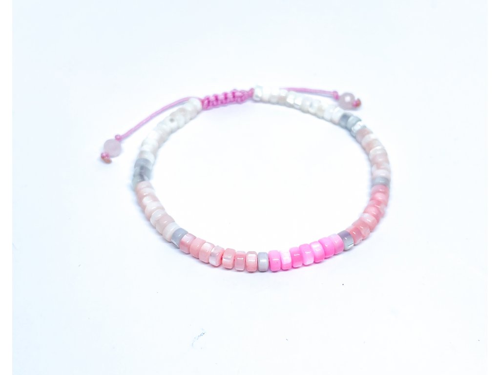 provázkový náramek z plochých perleťových korálků na růžové šňůrce