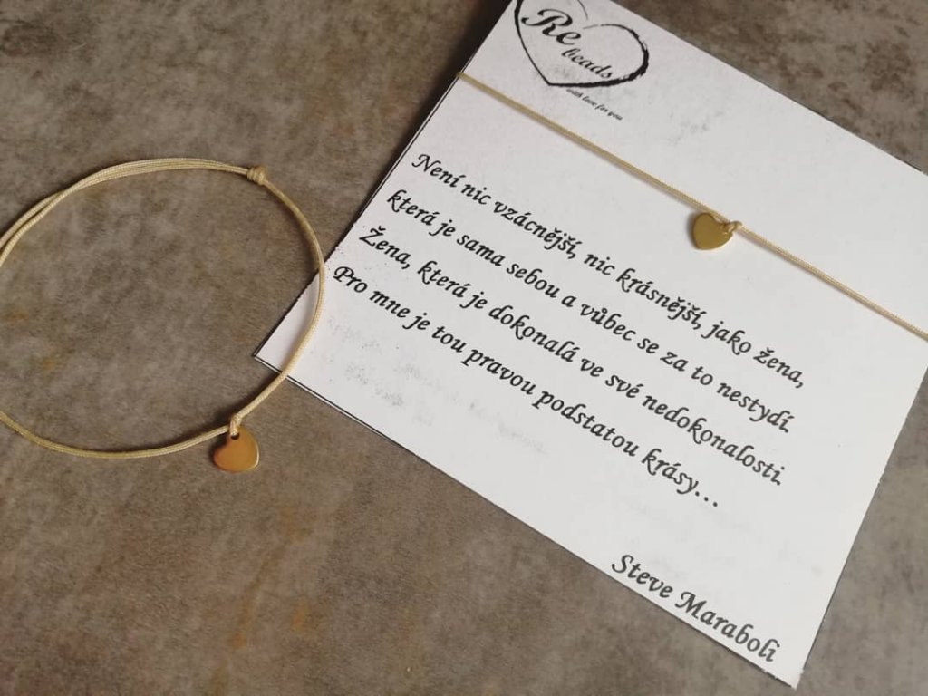 ocelové srdíčko ve zlaté barvě navlečené na béžové šňůrce