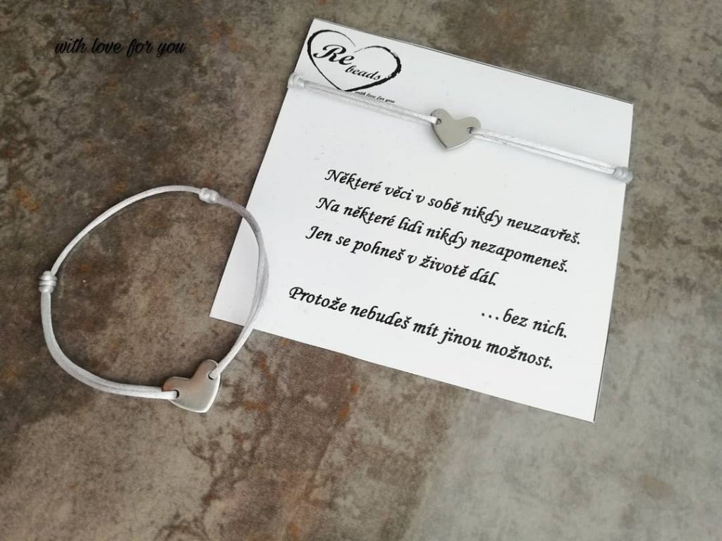 provázkový náramek ze stříbrné saténové šňůrky s ocelovým srdíčkem